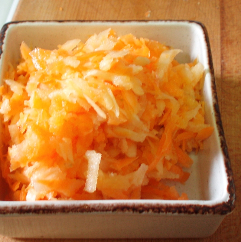 First, I grated a large carrot. I can get good carrots pretty easily at the farmer’s market, these days, even in midwinter – but that’s also a vegetable that any grocery store I’ve ever been in has. Even at this time of year, I’ve found carrots to always be inexpensive and reliably good quality. If you don’t have kohlrabi – which is much less common – you could just make a carrot salad, though it is less interesting. I suspect it would also work well with carrots and turnips – I’ll try that another time.