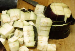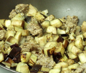 I chopped an onion, and started it sauteing. I diced a big purple eggplant small, until I had what looked like Enough Eggplant for the two of us – the rest will go in the ratatouille. (Note the precise scientific measurements… sometimes it just works that way.) I then added it to the pan to brown a little.