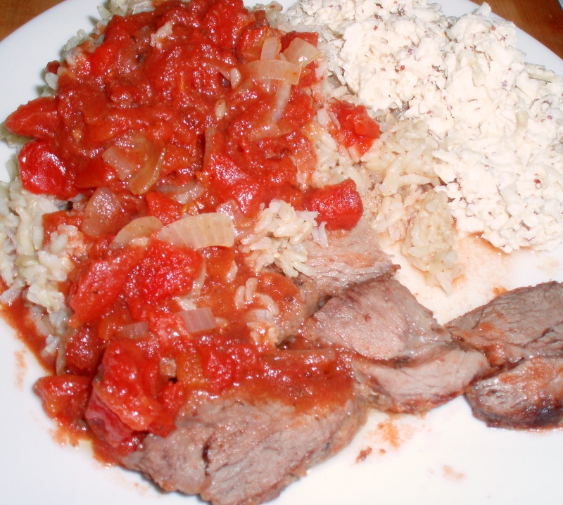 I served slices of beef with the tomatoes, over rice, with some of my celeriac salad. Since there are only two of us, we had plenty of leftovers… I’ve reheated the same combination, we ate tomatoes with other meats, I cut the beef up in bite sized pieces and added it to beans and soup – and I still have some left.