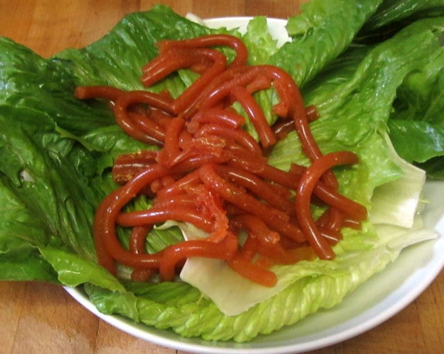 I made a salad of greens, and some of these peeping out from under the leaves… You can really play with them, as well as just serve the basic bowl of worms. (There is a temptation to serve them from a can, but I decided that sharp edges and such just made that a Bad Idea, no matter how clever it sounded.)