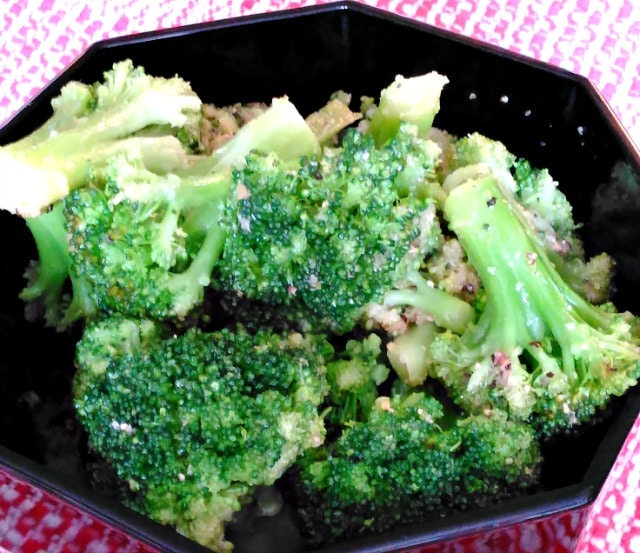 If you are making it nicely for a holiday meal, you can certainly steam fresh broccoli spears, as he did – that is lovely. But I realized it also works with leftover vegetables – doesn’t even have to be broccoli, though something firm… And it is a really useful treatment for frozen vegetables. I do suggest thawing them first, at least the first time you use a certain type, as some hold water and you don’t want it soggy.