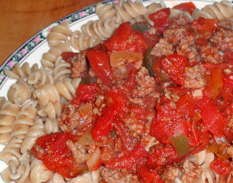 If I’d cooked the meat ahead with the onions, as I suggest in the original post, I could have skipped the step of cooking onions. I would probably not then have added garlic and peppers – I might have just used dried pepper flakes, or a hot sauce, and skipped the garlic all together. Started with the meat in the pan. It would not have speeded up the meal – the pasta still needed to cook – but it would have given it a bit longer to simmer and let the flavors meld – and it would have given me 5 minutes out of the kitchen. In this case, I’d come home and changed clothes, and such before going into the kitchen – but there might be times (especially if feeding a small child) when even that 5 minutes difference might matter…