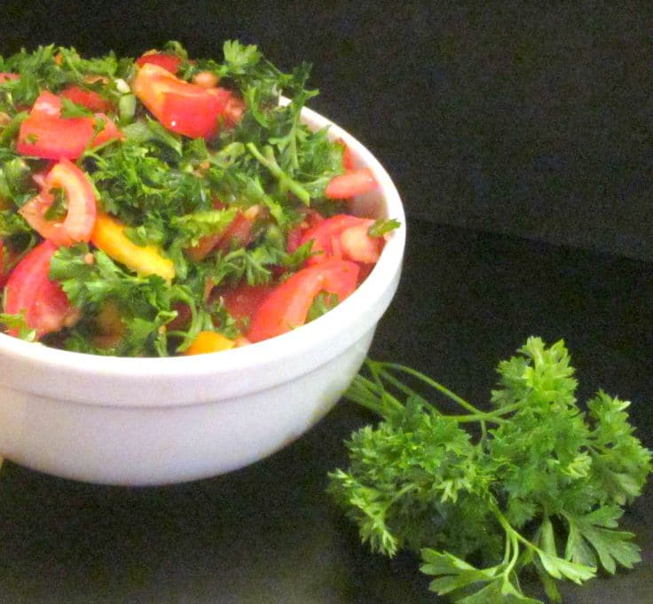 Essentially, the recipe for the basic Salsa Fresca is – Take however much you want of whatever fresh raw ingredients you want, chop them up, toss them together, let them rest a while to meld flavor, and enjoy! A little finesse.. make sure you remove core and any hard white parts of the tomatoes, seed and mince the peppers (you can use serrano instead of jalapeno,) discard the stringy stems of the parsley…  Customarily you add a pinch of salt, but that can contribute to wilting, if you’re going to keep it more than a few hours. We use this in about two days, since there are only two of us, so I leave the salt out, and add a sprinkle when I serve. Add a squeeze of lime juice if you have it, or a splash of wine vinegar (which I had,) as the acid not only adds to flavor but also helps the salsa stay fresh for that day or two.