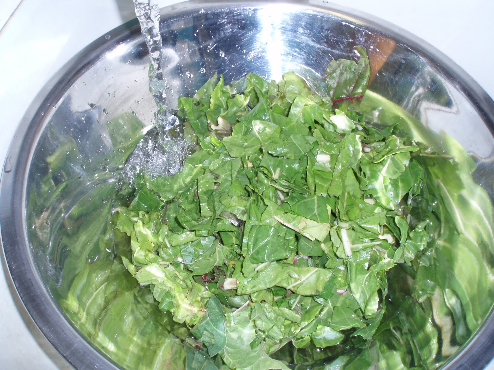 Take a bunch of greens. I prefer to chop them before washing, though you can do it the other way around. Trim the ends and any tough parts of the stems. I eat most of the stems of most vegetables, but I remove them if they are getting stringy. Chop the greens if desired.