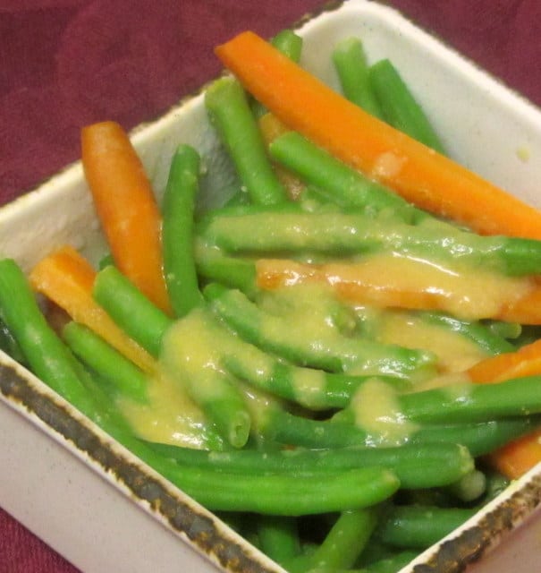 I have served green beans with miso sauce for years. I got the idea from a Japanese cookbook, but have varied it over time. (Simplified it, mostly… there were originally other ingredients.) It’s a very nice combination, and quite easy… It occurred to me that carrots would be a great addition. The color of course is beautiful, the vegetables have a slightly different texture at the tender crisp stage, and they just complement each other very well. (Better than peas and carrots, I think, which tend to be cooked mushy.)