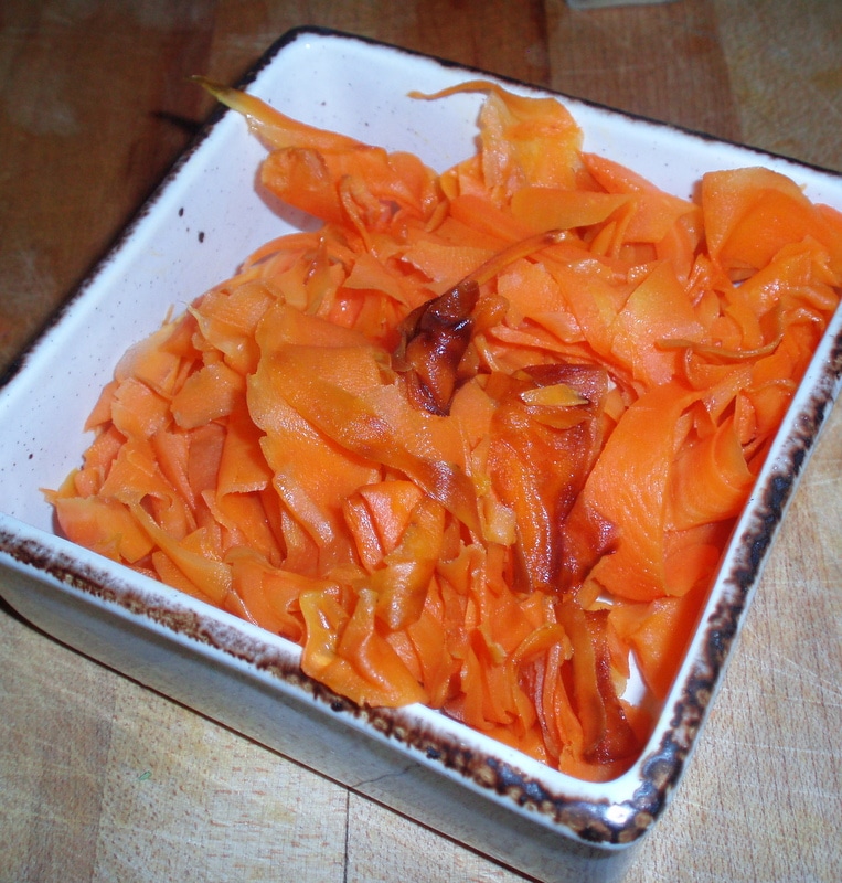 Now, if I were a proper foodie, with all the latest gadgets, I’d tell you now to take out your mandoline. And, in fact, if you have one (they can be useful) do take it out. But Grandma just used a swivel bladed vegetable peeler… and used it to shave the carrots down to a pile of thin curling shreds. (Like planing wood, if you’ve ever done or seen that.)