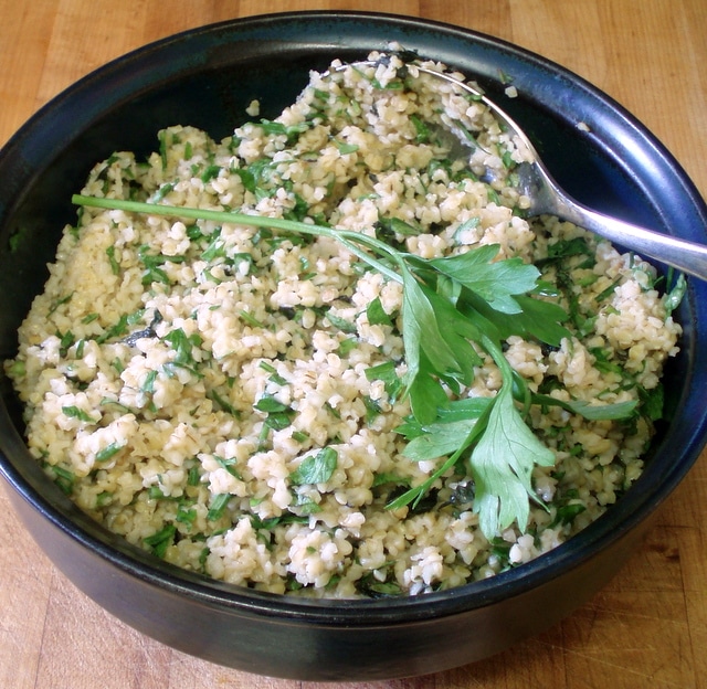 Then I checked the grain again. It was still warm, so I fluffed it some more, and let everything rest a while longer. The grain should be room temperature (or cooler) before adding the herbs, so they don’t wilt. About half an hour later it was cool enough, so I blended in the chopped herbs. I served it at room temperature, which is really the idea for flavor, though it’s fine chilled.