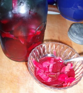 My mother used to make it with ordinary canned beets, an endive, and a recipe she had for Quick Pickled Beets. She used the endive at Christmas time – and sometimes other times – but also would substitute a raw onion, sliced into rings. The hot brine mellows it, so it is still a bit crunchy without being too pungent.
