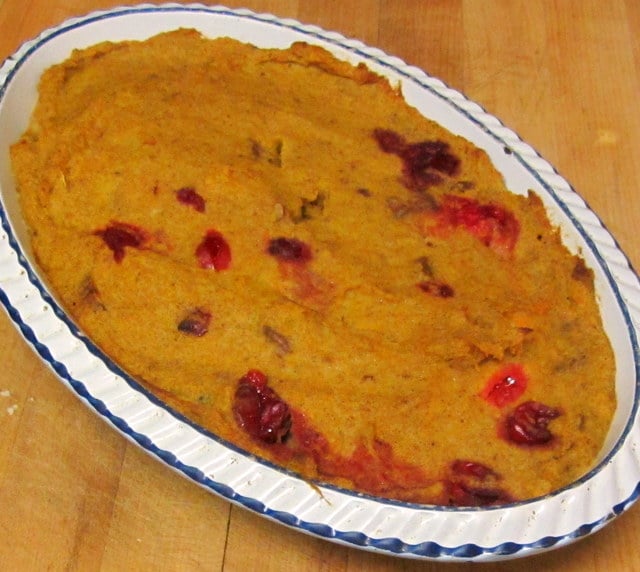 Then I stirred in half a cup of cranberries, and 1/4 cup of roughly chopped pecans. Poured it all in my one quart shallow baking dish, and baked it at 350 for half an hour.