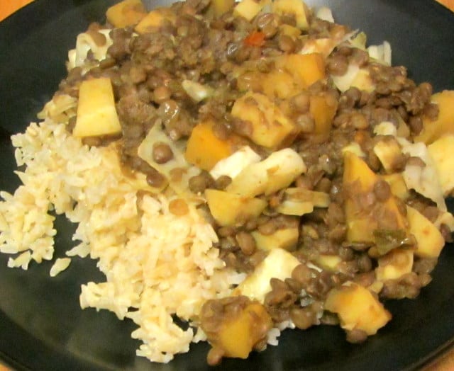 When the vegetables were soft, and the lentils were fully cooked, I spooned the lentils into the pan. Then I cut up – well, one of my “chunks” of cabbage, but this time I remembered to weigh it – 3/4 of a pound. I stirred it in, raised the heat a little, and covered the pan – about five minutes , until the cabbage was cooked. (You might prefer 10 minutes…)